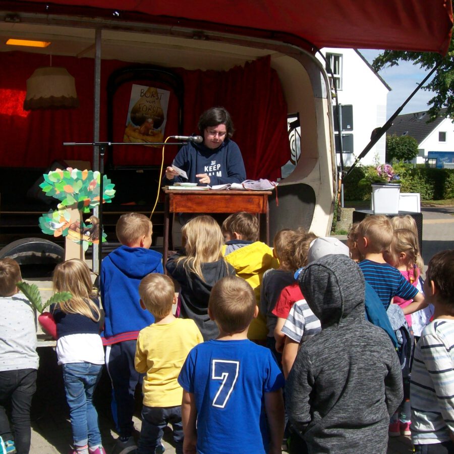 August 2021 - Mit "Borst vom Forst", einer mobilen Lesebühne und dem Bücherbus war ich rund um Rostock unterwegs, um insgesamt rund 200 Kinder zu besuchen. Großer Spaß!