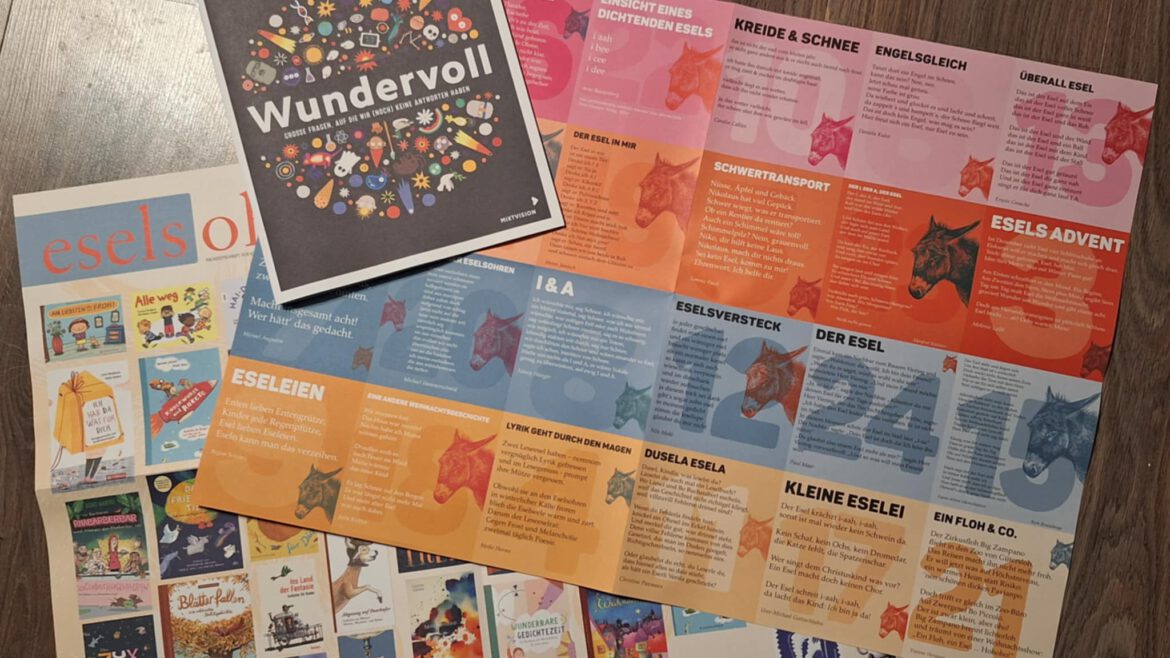Eselgedicht im «Eselsohr» By Yvonne in Allgemein on 5. Dezember 2025 Dezember 2025 – Dem weihnachtlichen «Eselsohr» liegt ein großes Adventskalender-Plakat mit 24 Esel-Gedichten wunderbarer Autor*innen bei. Und ich darf dabei sein! Mein «Floh & Co.» ist die Nummer 21.